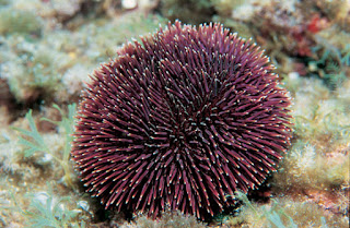 Sphaerechinus granularis.- Este pertenece a otro orden a los anteriores, es otra especie bastante común. Tiene un caparazón globoso, ligeramente apuntado en la zona aboral, y es de color violáceo o azulado.