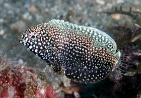 base superior de la aleta pectoral con una pequeña mancha negra; aletas dorsales y anales rojizas con manchas verdes de anillos azules con borde negro y algunas manchas se están fusionando y formando retículas verticales; la aleta caudal tiene reticulaciones rojizas alrededor de manchas de color amarillo verdoso con bordes negros, el margen distal tiene una ancha banda roja seguida de un contorno negro y luego de puntas blanquecinas en el radio; aleta pélvica translúcida o coloreada; los radios más externos son ligeramente amarillo rojizo con los radios más internos translúcidos. Color de los juveniles: pocas manchas negras irregulares en el cuerpo con barras rojas irregulares en la aleta anal ampliamente unidas distalmente con amarillo; una pequeña mancha negra en lugar de un ocelo posterior en la aleta dorsal y no hay grandes puntos traseros y ocelo en la aleta anal. Se encuentra en la Polinesia Francesa, islas Marquesas. Recogido a mano con redes y rotenona