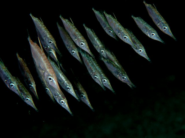 Aeoliscus punctulatus (1855).- También conocido como el camarón moteado o el pez navajo articulado , es miembro de la familia Centriscidae del orden Syngnathiformes (los peces pipa y los caballitos de mar ). Este pez adopta una posición de cabeza hacia abajo y cola hacia arriba como una adaptación para esconderse entre las espinas de los erizos de mar . Este pez se encuentra en aguas costeras en el Indo-Pacífico occidental. Su hábitat natural incluye lechos de pastos marinos y arrecifes de coral , donde se encuentran los erizos de mar