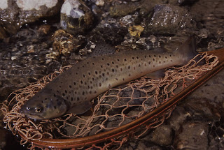 Salmo trutta macrostigma (1858) - Trucha de Córcega.- El área de distribución nativa de la trucha marrón se extiende desde el norte de Noruega y los afluentes del Mar Blanco en Rusia en el Océano Ártico hasta las montañas del Atlas en el norte de África. El límite occidental de su área de distribución nativa es Islandia en el Atlántico norte, mientras que el límite oriental está en los afluentes del Mar de Aral en Afganistán y Pakistán