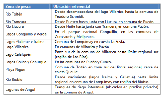 - Se prohíbe la pesca nocturna desde embarcaciones, entre las 21:00 horas y las 06:00 horas del día siguiente, en lugares que se encuentren a una distancia menor de 500 metros de la desembocadura de ríos o esteros y de los desagües de lagos, lagunas y tranques.